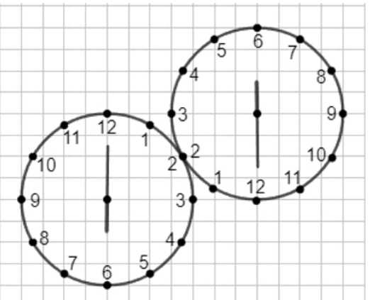 В обоих случаях движение стрелок не изменяется, так как симметрии не меняют направление обхода циферблата. Если обозначить угол поворота стрелки как \(\theta\), то после симметрии угол изменится на \(\theta’ = \theta + \pi\) (при отражении через центр) или на соответствующий угол в случае отражения через точку на окружности, но направление вращения останется прежним. Следовательно, симметрия меняет только положение стрелок, а не их движение.