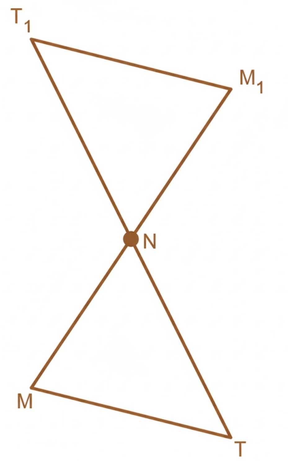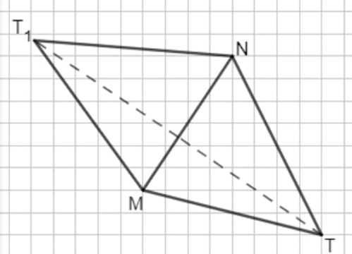 В итоге, треугольник \( MNT_1 \) является точным зеркальным отражением треугольника \( MNT \) относительно стороны \( MN \). Это значит, что все геометрические свойства исходного треугольника сохраняются, но ориентация меняется на противоположную, что хорошо видно на рисунке, где \( T_1 \) находится с другой стороны от \( MN \) по сравнению с точкой \( T \).