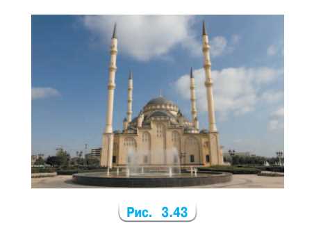 Рассмотрите изображение мечети в городе Грозном (рис. 3.43). Симметрично ли оно? Если да, то как расположена ось симметрии этого изображения?