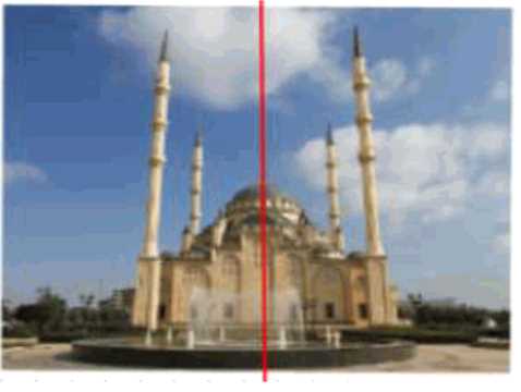 Изображение мечети в городе Грозном симметрично относительно красной вертикальной линии, которая проходит через центр композиции. Это означает, что если рассмотреть любую точку \( A \) на левой стороне от этой линии, то найдётся соответствующая точка \( A’ \) на правой стороне, такая что расстояние от точки \( A \) до линии симметрии равно расстоянию от точки \( A’ \) до этой же линии. При этом точки \( A \) и \( A’ \) расположены на одной горизонтальной линии, то есть зеркально отражены относительно оси симметрии.