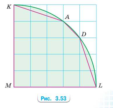 На сколько площадь пятиугольника \(KADLM\) (рис. 3.53) меньше площади четверти круга, радиус \(MK\) которого равен 5 см?