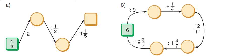 а) Выполним операции по порядку и подробно поясним каждый шаг. Умножение дроби на натуральное число означает умножение числителя при неизменном знаменателе: \( \frac{1}{3}\cdot 2=\frac{1\cdot 2}{3}=\frac{2}{3} \). Деление на дробь заменяем умножением на обратную дробь: \( \frac{2}{3}:\frac{1}{2}=\frac{2}{3}\cdot \frac{2}{1}=\frac{4}{3}=1\frac{1}{3} \). Чтобы выполнить вычитание смешанных чисел, переводим их в неправильные дроби: \( 1\frac{1}{3}=\frac{4}{3} \), \( 1\frac{1}{5}=\frac{6}{5} \). Приводим к общему знаменателю \(15\): \( \frac{4}{3}=\frac{20}{15} \), \( \frac{6}{5}=\frac{18}{15} \). Вычитаем числители при одинаковом знаменателе: \( \frac{20}{15}-\frac{18}{15}=\frac{2}{15} \). Таким образом, шаги дают согласованный результат: сначала \( \frac{1}{3}\cdot 2=\frac{2}{3} \), затем \( \frac{2}{3}:\frac{1}{2}=1\frac{1}{3} \), и окончательное вычитание \( 1\frac{1}{3}-1\frac{1}{5}=\frac{2}{15} \). Ответ: \( \frac{2}{15} \).