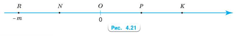 2. Чтобы понять расположение точек более подробно, примем начало отсчёта в точке \( O(0) \). Это стандартное начало для координатной оси, где все значения измеряются относительно нуля. На рисунке показано, что отрезки \( RN, NO, OP \) и \( PK \) равны между собой. При этом длина отрезка \( RO \) равна \( m \). Из равенства этих отрезков следует, что каждый из них составляет половину длины \( m \), то есть \( RN = NO = OP = PK = \frac{m}{2} \). Таким образом, весь отрезок \( RO \) разбит на две равные части, и каждая из точек \( N, P, K \) занимает определённое положение на числовой оси относительно нуля.