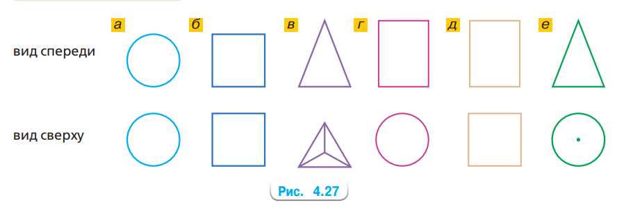 г) Фигура г спереди выглядит как прямоугольник, а сверху — как круг. Это характерно для цилиндра, который ограничен сверху и снизу кругами — основаниями цилиндра. Боковая поверхность цилиндра развёртывается в прямоугольник. Вид спереди показывает высоту и ширину цилиндра, а вид сверху — круглое основание. Следовательно, фигура г — цилиндр.