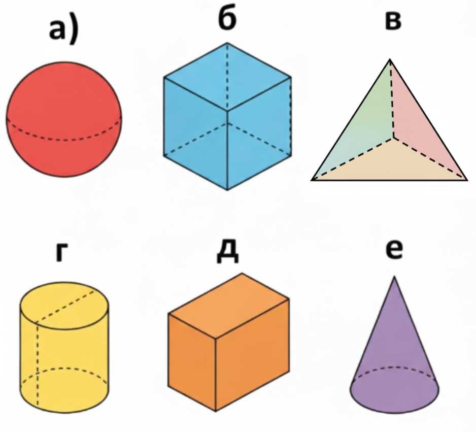 д) Фигура д спереди и сверху изображена прямоугольниками. Это признак прямоугольного параллелепипеда — объёмной фигуры с шестью гранями, каждая из которых является прямоугольником. Такая фигура отличается от куба тем, что её грани могут иметь разные размеры, но при этом все углы прямые. Вид спереди и сверху в форме прямоугольников подтверждает эту геометрию. Значит, фигура д — прямоугольный параллелепипед.