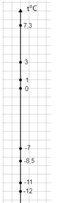Изобразите вертикальную координатную прямую, обозначьте её \(t, ℃\) и отметьте на ней числа, соответствующие температуре: \(-12 ℃\); \(-11 ℃\); \(-7 ℃\); \(+3 ℃\); \(-8,5 ℃\); \(+7,3 ℃\).
