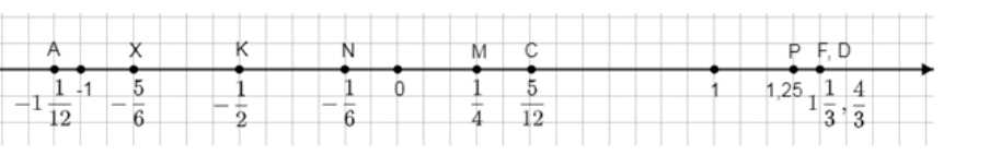 Приняв за единичный отрезок длину 12 клеток тетради, начертите координат-ную прямую и отметьте на ней точки M \(\left(\frac{1}{4}\right)\), K \(\left(-\frac{1}{2}\right)\), A \(\left(-\frac{1}{12}\right)\), \(C\left(\frac{1}{12}\right)\), F\(\left(\frac{1}{3}\right)\), X\(\left(-\frac{5}{6}\right)\), D\(\left(\frac{4}{3}\right)\), N\(\left(-\frac{1}{6}\right)\), P(1,25).