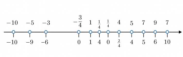 2) Геометрически преобразование \(x \mapsto -x\) есть осевая симметрия относительно нуля на координатной прямой: точка с координатой \(x\) переходит в точку на таком же расстоянии от нуля, но по другую сторону, то есть на координату \(-x\). Поэтому пары \(x\) и \(-x\) лежат симметрично: \((3,-3)\), \((-4,4)\), \((9,-9)\), \((-7{,}5,7{,}5)\), \((-5,5)\), \((-1\frac{1}{2},1\frac{1}{2})\), \((2\frac{3}{4},-2\frac{3}{4})\), \((6,-6)\), \((0,0)\), \((\frac{1}{4},-\frac{1}{4})\), \((1,-1)\), \((\frac{3}{4},-\frac{3}{4})\), \((-10,10)\). Ноль выступает центром симметрии и единственным числом, равным своему противоположному: \(0 = -0\). Дробные значения сохраняют модуль: \(\left|\frac{1}{4}\right| = \left|-\frac{1}{4}\right|\), так же как и смешанные дроби: \(\left|2\frac{3}{4}\right| = \left|-2\frac{3}{4}\right|\).