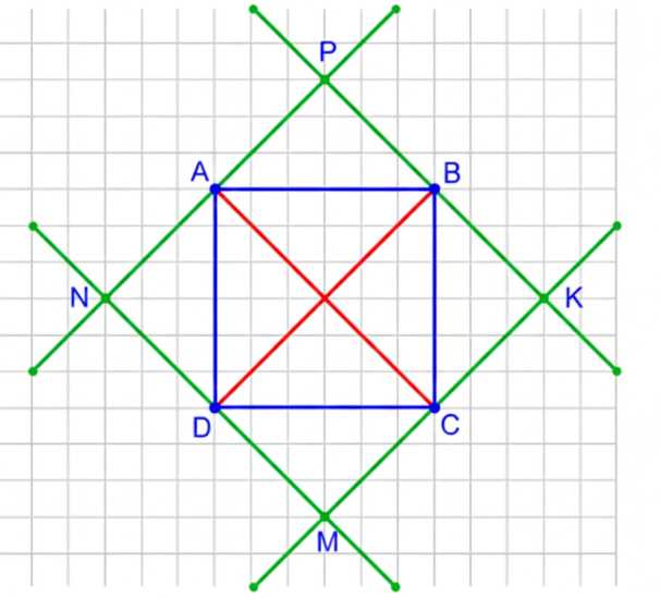 Рассмотрим квадрат \(ABCD\) с вершинами \(A, B, C, D\). В нем диагонали \(AC\) и \(BD\) пересекаются под прямым углом и равны по длине. Проведём через каждую вершину квадрата прямые, параллельные диагоналям: через \(A\) и \(C\) — прямые, параллельные диагонали \(BD\), а через \(B\) и \(D\) — прямые, параллельные диагонали \(AC\). Эти прямые пересекаются в точках \(M, N, P, K\).