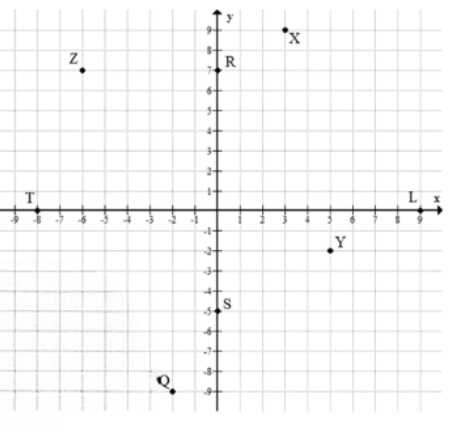 В системе координат с единичным отрезком 1 клетка отметьте точки \(X(3;\ 9),\ Y(5;\ -2),\ Z(-6;\ 7),\ Q(-2;\ -9),\ R(0;\ 7),\ S(0;\ -5),\)