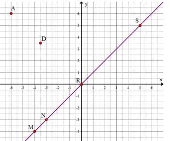 в) Таким образом, можно сделать вывод, что точки \(M\), \(N\), \(R\), \(S\) образуют одну прямую, которая задаётся уравнением \(y = x\), а точки \(A\) и \(D\) находятся вне этой прямой. Это подтверждается тем, что координаты \(A\) и \(D\) не удовлетворяют уравнению прямой, в отличие от остальных точек. Такой анализ позволяет точно определить принадлежность точек к одной линии на координатной плоскости.