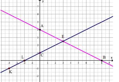 Точки: \(A(0;4)\), \(B(8;0)\), \(L(-2;0)\), \(K(-4;-1)\).