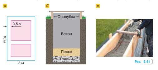 Родители Юры и Светы решили на следующий год начать строительство нового дома в деревне, где живут их родители. Сначала они планируют залить ленточный фундамент из бетона для деревянного дома размером 8 \(\times\) 12 м с одной внутренней перегородкой (рис. 6.41, а). Подземная часть фундамента планируется глубиной 0,9 м, а наземная часть высотой 0,40 м. Высота подушки гравия под фундамент должна составлять 15 \%, а песчаной 20 \% от глубины подземной части фундамента (рис. 6.41, б). Стоимость кубометра гравия с доставкой 1900 р., а песка \(\frac{7}{20}\) от стоимости бетона.
