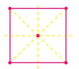 е) Квадрат имеет четыре оси симметрии: две — это медианы (вертикальная и горизонтальная), и две — диагонали.