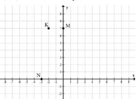б) На координатной плоскости точки задаются парой чисел — координатами \(x\) (абсцисса) и \(y\) (ордината). Точка \(K\) имеет координаты \((-2; 7)\). Это значит, что по горизонтальной оси \(x\) она смещена влево на 2 единицы от начала координат, а по вертикальной оси \(y\) поднята вверх на 7 единиц. Точка \(N\) с координатами \((-3; 0)\) лежит на оси \(x\), потому что ордината равна нулю, а абсцисса \(-3\) означает смещение влево на 3 единицы. Точка \(M\) расположена на оси \(y\), так как её абсцисса равна нулю, а ордината \(7\) указывает на положение на 7 единиц выше начала координат.