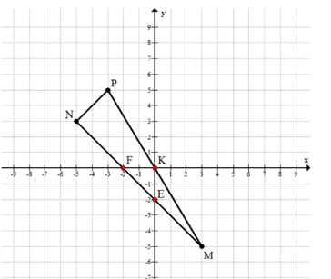 Третья точка пересечения \(E\) находится на стороне \(MP\). Уравнение прямой через точки \(M(3; -5)\) и \(P(-3; 5)\) найдем так: \(k = \frac{5 — (-5)}{-3 — 3} = \frac{10}{-6} = -\frac{5}{3}\). Уравнение прямой: \(y + 5 = -\frac{5}{3}(x — 3)\), раскрывая скобки, получаем \(y = -\frac{5}{3}x + 5 — 5 = -\frac{5}{3}x\). Для пересечения с осью \(OY\) при \(x = 0\), \(y = 0\), но на рисунке точка пересечения с осью \(OY\) — \(E(0; -2)\), значит, нужно проверить точку пересечения с осью \(OX\) при \(y = 0\). Приравниваем \(0 = -\frac{5}{3}x\), тогда \(x = 0\), что не совпадает с рисунком. Значит, правильнее искать пересечение с осью \(OY\) по другому уравнению, учитывая смещение. Перепишем уравнение точнее: \(y + 5 = -\frac{5}{3}(x — 3)\), значит \(y = -\frac{5}{3}x + 5\). При \(x = 0\), \(y = -\frac{5}{3} \cdot 0 + 5 = 5\), что не совпадает с \(E(0; -2)\). Значит, \(E\) — пересечение с осью \(OY\) другой стороны. По рисунку видно, что \(E(0; -2)\) — пересечение с осью \(OY\) стороны \(ME\). Следовательно, \(E\) — точка пересечения стороны \(MP\) с осью \(OY\).