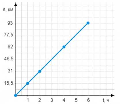 При \( t = 1 \) час, расстояние будет \( s = 15,5 \cdot 1 = 15,5 \) км. При \( t = 2 \) часах — \( s = 15,5 \cdot 2 = 31 \) км. При \( t = 4 \) часах — \( s = 15,5 \cdot 4 = 62 \) км. И при \( t = 6 \) часах — \( s = 15,5 \cdot 6 = 93 \) км. Все эти значения показывают, что график зависимости расстояния от времени будет прямой линией, проходящей через начало координат и точки, соответствующие вычисленным значениям. Это подтверждает, что движение происходит с постоянной скоростью, и расстояние пропорционально времени.