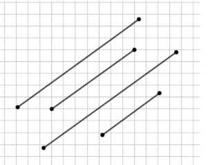 Четыре параллельных отрезка построены так, что все они имеют одинаковый наклон. Координаты концов отрезков взяты из сетки: