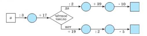 Рассмотрим второй случай при \(a = 42\). Сначала делим 42 на 3: \(42 : 3 = 14\). Это результат деления без остатка. К 14 прибавляем 17: \(14 + 17 = 31\). Число 31 — нечетное, так как оно не делится на 2 без остатка. Далее прибавляем к 31 число 19: \(31 + 19 = 50\). Число 50 — четное. Делим 50 на 2: \(50 : 2 = 25\). После этого умножаем 25 на 5: \(25 \cdot 5 = 125\). Таким образом, для \(a = 42\) итоговый результат равен 125.