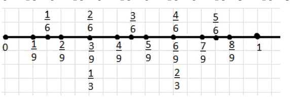 — \( \frac{1}{9}=\frac{2}{18} \), \( \frac{2}{9}=\frac{4}{18} \), \( \frac{3}{9}=\frac{6}{18} \), \( \frac{4}{9}=\frac{8}{18} \), \( \frac{5}{9}=\frac{10}{18} \), \( \frac{6}{9}=\frac{12}{18} \), \( \frac{7}{9}=\frac{14}{18} \), \( \frac{8}{9}=\frac{16}{18} \).