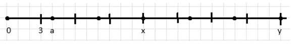 Общие кратные чисел \(3\) и \(a\) — это числа, делящиеся одновременно на \(3\) и на \(a\). Они образуют арифметическую прогрессию с шагом, равным их наименьшему общему кратному. Обозначим наименьшее общее кратное чисел \(3\) и \(a\) как \(\text{НОК}(3,a)\). Тогда каждое общее кратное имеет вид \(n\cdot \text{НОК}(3,a)\) для целого \(n\ge 1\). На рисунке первые два таких значения отмечены точками \(x\) и \(y\).