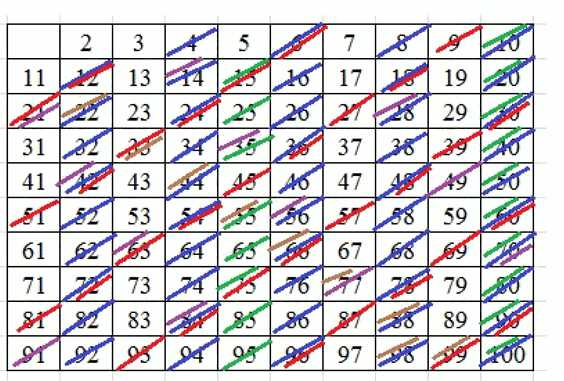 Найдите методом «решета Эратосфена» все простые числа среди первых ста натуральных чисел.