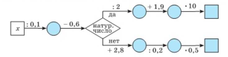 при \(x = 0,16\) начинаем с деления \(0,16\) на \(0,1\), получая \(0,16 : 0,1 = 1,6\). Это число показывает, сколько раз \(0,1\) входит в \(0,16\). Затем вычитаем \(0,6\): \(1,6 — 0,6 = 1\). Результат равен \(1\), что является натуральным числом, то есть целым положительным числом. Далее делим \(1\) на \(2\): \(1 : 2 = 0,5\), получая половину единицы. Сложение \(0,5 + 1,9 = 2,4\) увеличивает значение, а умножение на \(10\) даёт \(2,4 \cdot 10 = 24\), что является целым числом и итоговым результатом для данного случая.