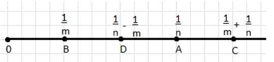 а) Рассмотрим выражение \( \frac{1}{m} + \frac{1}{n} = C \). Здесь \( m \) и \( n \) — числа, для которых мы берём обратные значения, а затем складываем их. Сумма этих дробей равна некоторой константе \( C \). Чтобы понять это равенство, важно заметить, что каждая дробь представляет собой расстояние от нуля до точки на числовой оси, обозначенной как \( \frac{1}{m} \) и \( \frac{1}{n} \). Сумма этих значений показывает, что точка \( C \) на оси находится на расстоянии, равном сумме этих двух отрезков. Таким образом, \( C \) — это сумма двух положительных величин, каждая из которых обратна соответствующему числу.
