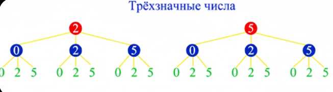 б) Для того чтобы трёхзначное число делилось на 5, оно должно оканчиваться на 0 или 5. Это правило связано с тем, что любое число, заканчивающееся на 0 или 5, делится на 5 без остатка. В нашем наборе допустимых цифр для последнего разряда есть 0 и 5, поэтому перебираем все возможные варианты, где последняя цифра — 0 или 5. Первая цифра снова не может быть 0, чтобы число оставалось трёхзначным. Остальные цифры могут быть любыми из предложенных вариантов. В результате получаем числа: 200, 205, 220, 225, 250, 255, 500, 505, 520, 525, 550, 555.