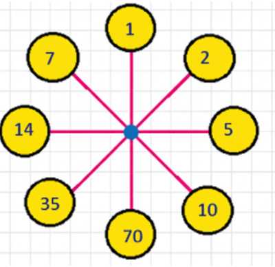 В кружках нужно вписать делители числа 70, такие что произведение чисел в соседних кружках равно 70.