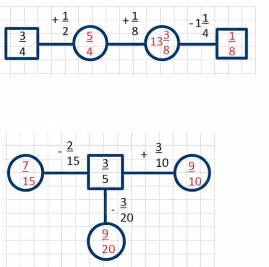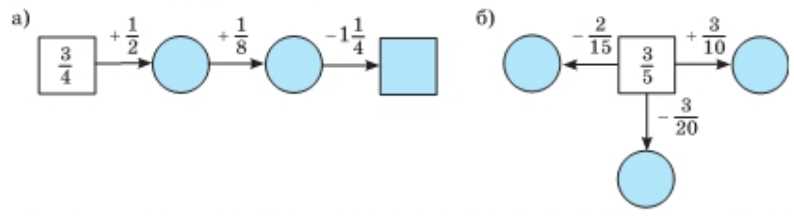 Наконец, разность \(\frac{3}{5}-\frac{3}{20}\) удобно вычислять через общий знаменатель \(20\), так как \(20\) кратно \(5\). Преобразуем \(\frac{3}{5}\) к знаменателю \(20\): умножаем числитель и знаменатель на \(4\), получаем \(\frac{12}{20}\). Вычитаем: \(\frac{12}{20}-\frac{3}{20}=\frac{12-3}{20}=\frac{9}{20}\). Все полученные ответы согласуются с изображением: для сложения по пункту б имеем \(\frac{9}{10}\), для вычитания со знаменателем \(15\) — \(\frac{7}{15}\), и для разности со знаменателем \(20\) — \(\frac{9}{20}\).