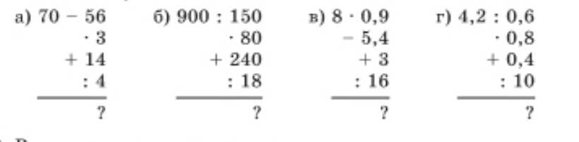 г) Делим десятичные, приводя к удобным отношениям: \(4{,}2:0{,}6=7\), поскольку обе величины кратны \(0{,}6\) и \(4{,}2=7\cdot0{,}6\). Проверяем результат обратным действием: \(7\cdot0{,}8=5{,}6\); здесь умножение на \(0{,}8\) демонстрирует работу с десятыми в произведении. Далее выполняем сложение десятичных, соблюдая запятую по разрядам: \(5{,}6+0{,}4=6\). Завершает вычисления деление на \(10\), что эквивалентно сдвигу запятой на один разряд влево: \(6:10=0{,}6\).
