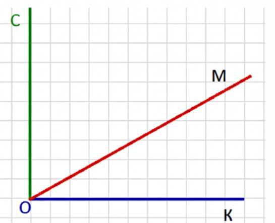 Луч ОМ разделил угол СОК, равный \(90^\circ\), на два угла СОМ и МОК. Угол СОМ больше угла МОК в \(2\frac{3}{5}\) раза. Чему равны углы СОМ и МОК? Постройте эти углы с помощью транспортира.