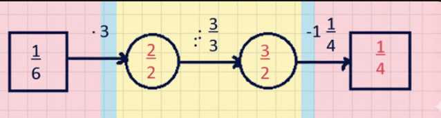 Далее делим полученную дробь \( \frac{1}{2} \) на \( \frac{1}{3} \). Деление дробей выполняется умножением первой дроби на обратную вторую: \( \frac{1}{2} : \frac{1}{3} = \frac{1}{2} \cdot \frac{3}{1} = \frac{3}{2} \). Это неправильная дробь, которую можно записать как смешанное число \( 1 \frac{1}{2} \).