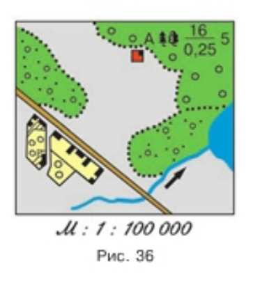 Определите по карте (рис. 36) расстояние от опушки леса (точка \(A\)) до точки пересечения дороги с рекой. Масштаб карты \(1:100\,000\).