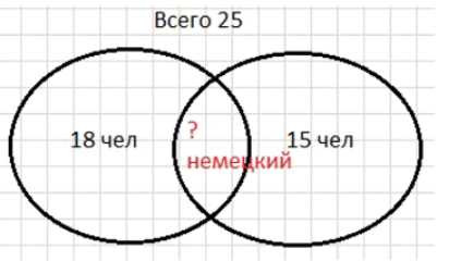 1) Для начала определим, сколько человек изучают немецкий язык. В задаче даны данные: всего 25 человек изучают языки, при этом 18 человек изучают английский, а 15 человек — французский. Число людей, изучающих немецкий язык, находится в пересечении этих двух групп. Чтобы найти это пересечение, нужно сложить количество изучающих английский и французский языки и вычесть общее число всех изучающих языки: