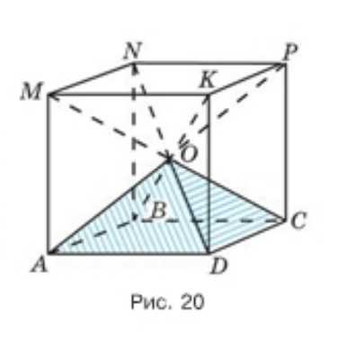 Из рисунка 20 видно, что куб можно составить из шести одинаковых четырёхугольных пирамид, у которых вершина \(O\), а основаниями служат грани куба. Найдите объём пирамиды, если ребро куба 1,2 см. Найдите ребро куба, если объём одной пирамиды \(\frac{1}{6}\ \text{см}^3\).