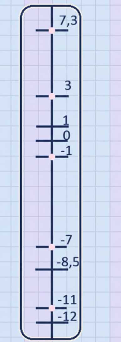 Рассмотрим температуры по порядку. Температура \(-12^\circ C\) — самая низкая, поэтому её отметка располагается в самом низу шкалы. Следующая температура \(-11^\circ C\) находится чуть выше, на следующей отметке. Температура \(-8,5^\circ C\) находится между отметками \(-8^\circ C\) и \(-9^\circ C\), поэтому её отметка расположена между этими двумя значениями. Температура \(-7^\circ C\) находится выше на одну отметку. Температура \(+3^\circ C\) расположена выше нуля и отмечена на соответствующей отметке. Наконец, температура \(+7,3^\circ C\) чуть выше отметки \(+7^\circ C\), что видно на верхней части шкалы.