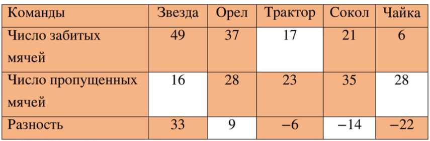 1) В таблице для «Звезды» известны забитые мячи \(49\) и разность \(33\). Разность в таких задачах понимается как \( \text{забитые} — \text{пропущенные} \), то есть \(49-\text{пропущенные}=33\).