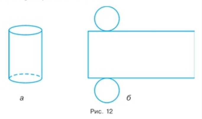 На рисунке 12, а изображён цилиндр. Сверху и снизу цилиндр ограничен кругами, которые называются основаниями цилиндра. Развёртка боковой поверхности цилиндра — прямоугольник. На рисунке 12, б изображена развёртка поверхности цилиндра. Попробуйте вычислить площадь поверхности цилиндра, если его высота 5 см, а радиус оснований 2 см.