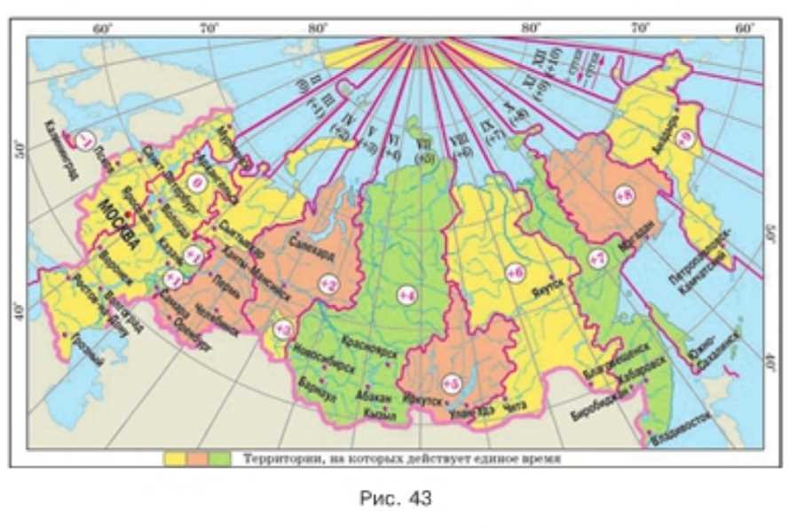 На рисунке 43 показана карта России с часовыми поясами. Определите с её помощью:
