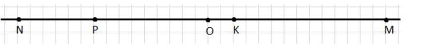 На рисунке видно, что точки \(N\), \(P\), \(K\), \(M\) расположены на координатной прямой относительно начала отсчета \(O\) на следующем расстоянии в клетках: \(N\) — 15 клеток влево, \(P\) — 9 клеток влево, \(K\) — 2 клетки вправо, \(M\) — 14 клеток вправо.