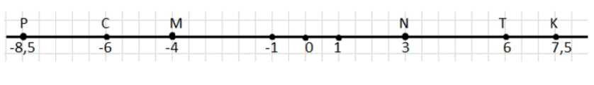 Точки с положительными координатами размещаются в правой части числовой оси. Точка \(N\) имеет координату \(3\), и она находится точно на третьем делении вправо от \(0\). Точка \(T\) с координатой \(6\) расположена на шестом делении. Для точки \(K\) с координатой \(7.5\) мы имеем положительное дробное значение. Она должна быть размещена на \(7.5\) единичных отрезков вправо от \(0\), то есть ровно посередине между целыми числами \(7\) и \(8\). Визуальная проверка показывает, что все шесть точек — \(P (-8.5)\), \(C (-6)\), \(M (-4)\), \(N (3)\), \(T (6)\), \(K (7.5)\) — размещены на координатной прямой в порядке возрастания их координат, что является основным принципом построения числовой оси.
