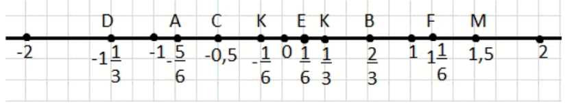 Для удобства проверки и исключения ошибок при сравнении смешанных, десятичных и обыкновенных дробей, преобразуем все заданные координаты к общему знаменателю \(6\). Точка \(K\) с координатой \(\frac{1}{3}\) преобразуется в \(\frac{2}{6}\). Точка \(C (-0.5)\) соответствует дроби \(-\frac{1}{2}\), или \(-\frac{3}{6}\). Точка \(D (-1\frac{1}{3})\) представляет собой неправильную дробь \(-\frac{4}{3}\), которая в шестых долях равна \(-\frac{8}{6}\). Координаты \(E (\frac{1}{6})\) и \(A (-\frac{5}{6})\) уже записаны в удобном виде. Точка \(F (1\frac{1}{6})\) равна \(\frac{7}{6}\). Точка \(B (\frac{2}{3})\) преобразуется в \(\frac{4}{6}\). Координата \(K (-\frac{1}{6})\) также удобна для проверки. Наконец, точка \(M (1.5)\) соответствует \(\frac{3}{2}\), или \(\frac{9}{6}\). Таким образом, мы имеем полный набор координат в едином формате: \(D (-\frac{8}{6}), A (-\frac{5}{6}), C (-\frac{3}{6}), K (-\frac{1}{6}), E (\frac{1}{6}), K (\frac{2}{6}), B (\frac{4}{6}), F (\frac{7}{6}), M (\frac{9}{6})\).