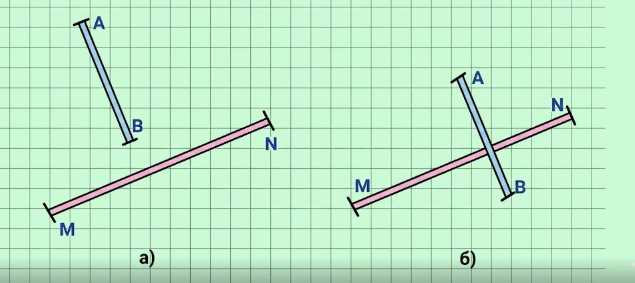 б) Здесь сначала проверяем обязательное условие перпендикулярности: у отрезков должна быть общая точка. На рисунке в пункте б) видно, что \(AB\) пересекает \(MN\), то есть существует точка пересечения, в которой эти два направления встречаются. Это означает, что условие пересечения выполнено, и угол между отрезками можно рассматривать именно в этой точке.