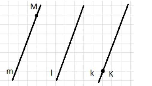Используем свойство: если две прямые параллельны одной и той же прямой, то они параллельны между собой. Логика такая: раз \(m\) имеет то же направление, что и \(l\), а \(k\) тоже имеет то же направление, что и \(l\), то направления \(m\) и \(k\) совпадают, значит они не могут пересечься и являются параллельными.