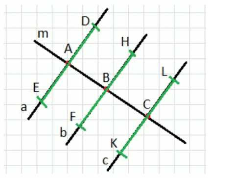 Начертите прямую \(m\) и отметьте на ней три точки — \(A\), \(B\) и \(C\). Через эти точки проведите прямые, перпендикулярные прямой \(m\). Отметьте на этих прямых параллельные отрезки.
