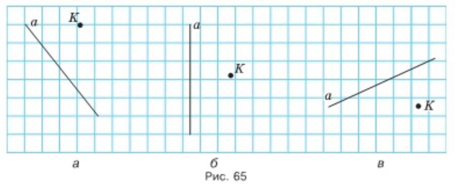 Перечертите рисунок 65 в тетрадь. Проведите через точку \(K\) прямую: а) параллельную прямой \(a\); б) перпендикулярную прямой \(a\).