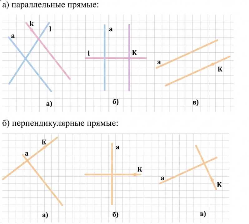 в) На рисунке прямые \(a\) и \(k\) пересекаются под углом, который выглядит как прямой: одна линия наклонена вверх вправо, а другая наклонена так, что «перекрывает» ее под прямым углом. Это соответствует ситуации, когда при повороте направления одной прямой на \(90^\circ\) получается направление другой.