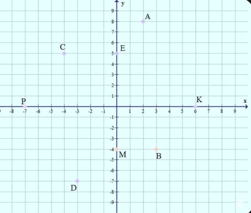 Постройте координатные прямые \(x\) и \(y\) и отметьте точки \(A(2;8)\), \(B(3;-4)\), \(C(-4;5)\), \(D(-3;-7)\), \(E(0;5)\), \(M(0;-4)\), \(K(6;0)\), \(P(-7;0)\).